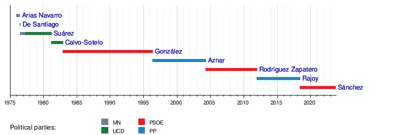 Pedro Sánchez of the Spanish Socialist Workers' Party (PSOE) has been prime minister since 2 June 2018, after a successful motion of no confidence against former prime minister Mariano Rajoy. The Sánchez government technically ceased on 29 April 2019 after the 2019 Spanish general election, but was acting afterwards. However, following the November 2019 general election,[3] Sánchez earned a second mandate as prime minister after receiving a plurality of votes in the second round vote of his investiture at the Congress of Deputies on 7 January 2020.[4] He then resumed being the official prime minister after he was sworn in by King Felipe on 8 January 2020.[5][6] His new government was then sworn in by King Felipe on 13 January 2020.[7][8][9][10]