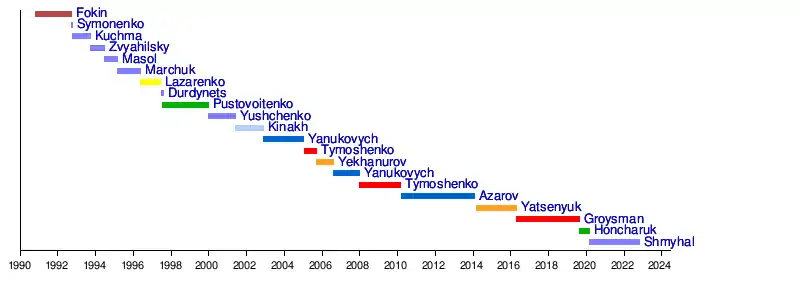 The current prime minister is Denys Shmyhal, who was sworn in on 4 March 2020 following the resignation of Oleksiy Honcharuk.[4]