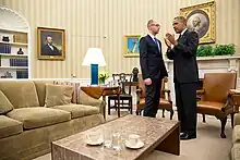 Before the constitutional reform of 2004, the prime minister was usually dismissed unilaterally by the president. After the reform, the prime minister can only be dismissed by the parliament.[11][12] Formally, the Verkhovna Rada needed to pass a resolution of no confidence of the cabinet, which had to result in the prime minister's resignation. However, the parliament could not put such a resolution to the vote within one year of the approval of the cabinet's official programme.[14] The Cabinets of prime ministers Viktor Yushchenko and Viktor Yanukovych were dismissed in this way, with the latter refusing to tender his resignation to the president claiming a violation of the one-year period condition. The Cabinet of Yuriy Yekhanurov had also been formally dismissed, but the parliamentary act was subsequently repealed.