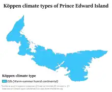 The climate of the island is a maritime climate considered to be moderate and strongly influenced by the surrounding seas.[14][15] As such, it is milder than inland locations owing to the warm waters from the Gulf of St. Lawrence.[16] The climate is characterized by changeable weather throughout the year; it has some of the most variable day-to-day weather in Canada, in which specific weather conditions seldom last for long.[15]