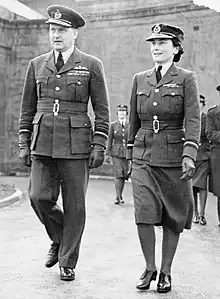 The Duke and Duchess of Gloucester travelled extensively, undertaking various engagements. The public appearances of the Duchess included launching HMS Gloucester on 19 October 1937.[12] During World War II, the Duchess worked with the Red Cross and the Order of St John.[13][14] She became head of the Women's Auxiliary Air Force (WAAF) in 1939 as Senior Controller, changed to Air Commandant on 12 March 1940,[15] and appointed Air Chief Commandant on 4 March 1943, when she took over as director until August 1944. When the WAAF became the Women's Royal Air Force (WRAF) in 1949, she was appointed an Air Chief Commandant (equivalent to Air vice-marshal) in the new service on 1 February 1949.[16] She was promoted to Air marshal on 1 September 1968,[17] and to air chief marshal in the Royal Air Force on 23 February 1990.[18] She also served as deputy to Queen Elizabeth, the consort of George VI, as Commandant-in-Chief of the Nursing Corps.[14]