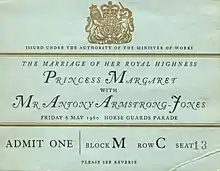 Margaret married Armstrong-Jones at Westminster Abbey on 6 May 1960.[135] The ceremony was the first royal wedding to be broadcast on television,[60] and it attracted viewing figures of 300 million worldwide.[136] 2,000 guests were invited for the wedding ceremony.[129] Margaret's wedding dress was designed by Norman Hartnell and worn with the Poltimore tiara.[35] She had eight young bridesmaids, led by her niece, Princess Anne.[137] The Duke of Edinburgh escorted the bride, and the best man was Dr Roger Gilliatt.[129] The Archbishop of Canterbury Geoffrey Fisher conducted the marriage service.[129] Following the ceremony, the couple made the traditional appearance on the balcony of Buckingham Palace.[129] The honeymoon was a six-week Caribbean cruise aboard the royal yacht Britannia.[138] As a wedding present, Colin Tennant gave her a plot of land on his private Caribbean island, Mustique.[139] The newlyweds moved into rooms in Kensington Palace.[140]