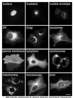 Other methods for elucidating the cellular location of proteins requires the use of known compartmental markers for regions such as the ER, the Golgi, lysosomes or vacuoles, mitochondria, chloroplasts, plasma membrane, etc. With the use of fluorescently tagged versions of these markers or of antibodies to known markers, it becomes much simpler to identify the localization of a protein of interest. For example, indirect immunofluorescence will allow for fluorescence colocalization and demonstration of location. Fluorescent dyes are used to label cellular compartments for a similar purpose.[61]