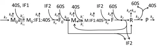 The process of amino acid building to create protein in translation is a subject of various physic models for a long time starting from the first detailed kinetic models such as[23] or others taking into account stochastic aspects of translation and using computer simulations. Many chemical kinetics-based models of protein synthesis have been developed and analyzed in the last four decades.[24][25] Beyond chemical kinetics, various modeling formalisms such as Totally Asymmetric Simple Exclusion Process (TASEP),[25]Probabilistic Boolean Networks (PBN), Petri Nets and max-plus algebra have been applied to model the detailed kinetics of protein synthesis or some of its stages. A basic model of protein synthesis that takes into account all eight 'elementary' processes has been developed,[22] following the paradigm that "useful models are simple and extendable".[26] The simplest model M0 is represented by the reaction kinetic mechanism (Figure M0). It was generalised to include 40S, 60S and initiation factors (IF) binding (Figure M1'). It was extended further to include effect of microRNA on protein synthesis.[27] Most of models in this hierarchy can be solved analytically. These solutions were used to extract 'kinetic signatures' of different specific mechanisms of synthesis regulation.