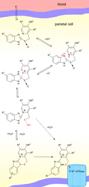 Proton pump inhibitors act by irreversibly blocking the hydrogen/potassium adenosine triphosphatase enzyme system (the H+/K+ ATPase, or, more commonly, the gastric proton pump) of the gastric parietal cells.[70] The proton pump is the terminal stage in gastric acid secretion, being directly responsible for secreting H+ ions into the gastric lumen, making it an ideal target for inhibiting acid secretion. Because the H,K-ATPase is the final step of acid secretion, an inhibitor of this enzyme is more effective than receptor antagonists in suppressing gastric acid secretion.[71] All of these drugs inhibit the gastric H,K-ATPase by covalent binding, so the duration of their effect is longer than expected from their levels in the blood.[72]