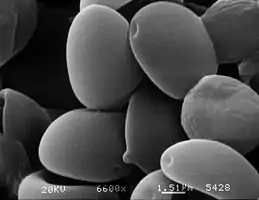 The spores are elongated-ellipsoid in face view, roughly terete (more or less cylindrical but usually tapering at both ends), slightly inequilateral or asymmetrical in side view—the so-called "mango" form. They typically have dimensions of 12–14 by 6.6–7.7 by 6–7.5 μm, although some spores have irregular shapes and are strongly elongated, up to 23 μm. Spores are thick-walled (generally between 1–1.5 μm), dark yellowish brown, and have a broad germ pore. The variety bonetii has smaller spores measuring 10–13 by 6–7.5 by 6–7 μm.[1]