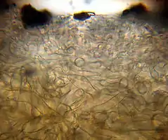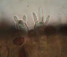 The basidia (spore-bearing cells) measure 24–33 by 6.6–8.8 μm, and may be attached to anywhere from one to four spores, although four-spored basidia are most common. They are hyaline to sometimes somewhat yellowish, club-shaped or roughly cylindrical, and some have a slight constriction around the middle. The cheilocystidia (cystidia on the edge of a gill) are abundant, forming a sterile band on the gill edge. They are hyaline, fusoid-ampullaceous (with a shape ranging from a spindle to a swollen bottle), with dimensions of 20–45 by 5–8.2 μm, and have a filamentous neck measuring 6–11 by 1.6–2.5 μm. The pleurocystidia (cystidia on the gill face) are scattered, similar to the cheilocystidia in form and size, hyaline, and some have bifurcated or branched necks.[1]