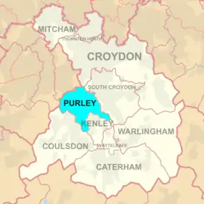 Purley lies within the Croydon South parliamentary constituency, where voters have consistently returned Conservative Party MPs to the local seat since 1974. Purley has been staunchly conservative and its amalgamation into the London borough of Croydon in 1965 helped consolidate the middle class domination of that borough.[29] The Purley electoral ward returned Conservative party councillors in Croydon London Borough Council elections from 1965 up until the reorganisation of 2018. In 2018, Purley was split into two wards; Purley and Woodcote, and Purley Oaks and Riddlesdown.[30]