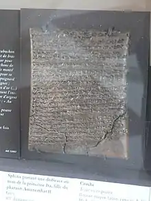 The events leading to the destruction of the royal palace did not cause the destruction of the whole city.[139] The Shattiwaza treaty, which describes the events of the first Syrian war, mentions that Qatna was invaded and destroyed, and its people were deported during the war.[142] However, Idanda's successor, Akizzi, was ruling in the second half of the Egyptian pharaoh Akhenaten's reign following the first Syrian war,[143] or shortly before the second Syrian war.[note 16][144] This discrepancy can be explained if the treaty did not mention the events in a chronological order; many scholars, such as Wilhelm, believe that the author of the document organized the text according to the principle of association, rather than following the sequence of events.[142]