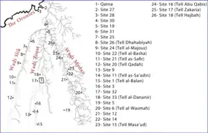 The city is located in the countryside, 18 km (11 mi) north of Homs.[12] It was founded on a limestone plateau,[13] and its extensive remains suggest fertile surroundings with abundant water, which is not the case in modern times.[14] Three northward flowing tributary wadis (Mydan, Zorat and Slik) of the Orontes River cross the region of Qatna,[15] enclosing an area 26 km (16 mi) north–south and 19 km (12 mi) east–west.[14] The city lay along the central wadi (Zorat),[15] surrounded by at least twenty five satellite settlements, most of them along the Mydan (marking the eastern border of the region) and Slik (marking the western border of the region) wadis.[15][16] The wadis are now dry most of the year, but during the rainy season their discharge is disproportional to the size of their valleys, suggesting that the region was much more humid and water was more abundant in the past.[15] The early city, dating to the Early Bronze Age IV (2200–2100 BC), was built in a circular plan;[17] this circular site became the upper city (acropolis) of Qatna's later phases and was surrounded by a lower rectangular city.[18]
