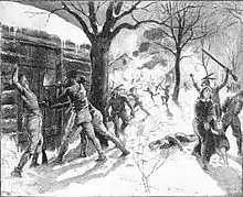 There were also a series of raids deep into New England by French and Indigenous forces aimed at securing captives. There was an active trade in captives, as families and communities struggled to raise ransoms to reclaim them. In February 1704, Jean-Baptiste Hertel de Rouville led 250 Abenaki and Caughnawaga Indians (mostly Mohawk) and 50 French Canadians in a raid on Deerfield in the Province of Massachusetts Bay. They destroyed the settlement, killing many and capturing more than 100 captives. These were taken on an overland journey hundreds of miles north to the Caughnawaga mission village south of Montreal. Most of the children who survived the journey were adopted by Mohawk families. Several adults were later redeemed (ransomed) or released in negotiated prisoner exchanges, including the minister, John Williams, who tried for years without success to ransom his daughter Eunice. She became fully assimilated, marrying a Mohawk man.[46] Likewise in August 1704, there was a raid in Marlborough (in the part of town to later become Westborough), from which captives were also taken to Caughnawaga.[47] There was an active slave trade of the captive colonists during these years, and communities raised funds to ransom their citizens from Indigenous captivity. For instance a captured boy, Ashur Rice, was returned to Marlborough after he was ransomed in 1708 by his father Thomas Rice.[47]
