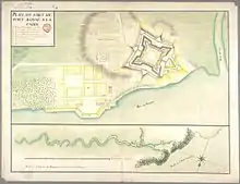 Newfoundland's coast was dotted with small French and English communities, with some fishing stations occupied seasonally by fishermen from Europe.[67] Both sides had fortified their principal towns, the French at Plaisance on the western side of the Avalon Peninsula, the English at St. John's and in Conception Bay (see Carbonear Island).[68] During King William's War, d'Iberville had destroyed most of the English communities in 1696–97,[69] and the island again became a battleground in 1702. In August of that year, an English fleet under the command of Commodore John Leake descended on the outlying French communities but made no attempts on Plaisance.[70] During the winter of 1705, Plaisance's French governor Daniel d'Auger de Subercase retaliated, leading a combined French and Mi'kmaq expedition that destroyed several English settlements and unsuccessfully besieged Fort William at St. John's. The French and their Indigenous allies continued to harass the English throughout the summer and did damages to the English establishments claimed at £188,000.[71] The English sent a fleet in 1706 that destroyed French fishing outposts on the island's northern coasts.[72] In December 1708, a combined force of French, Canadian, and Mi'kmaq volunteers captured St. John's and destroyed the fortifications. They lacked the resources to hold the prize, however, so they abandoned it, and St. John's was reoccupied and refortified by the English in 1709. (The same French expedition also tried to take Ferryland, but it successfully resisted.)[73]
