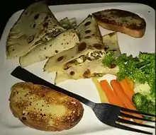 A quesadilla (/ˌkeɪsəˈdiːjə/; Spanish: [kesaˈðiʝa] ⓘ; Mexican diminutive of quesada[1][2]) is a Mexican dish consisting of a tortilla that is filled primarily with cheese, and sometimes meats, spices, and other fillings, and then cooked on a griddle or stove.[3] Traditionally, a corn tortilla is used, but it can also be made with a flour tortilla.