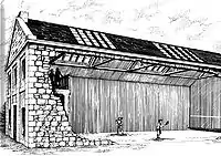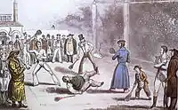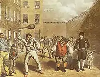 Historians generally assert that rackets began as an 18th-century pastime in London's King's Bench and Fleet debtors' prisons. The prisoners modified the game of fives (in the process creating Bat Fives) by using tennis rackets to speed up the action. They played against the prison wall, sometimes at a corner to add a sidewall to the game. Rackets then became popular outside the prison, played in alleys behind pubs. It spread to schools, first using school walls, and later with proper four-wall courts being specially constructed for the game. The lithograph at right dating from 1795 shows schoolboys 'hitting up' outside the Harrow School 'Old School' buildings.[1]
