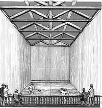 Eglinton Castle in Scotland, now largely demolished, had a "Racket Hall" which is first shown on the 1860 OS map, but estate records show that it was built shortly after 1839, the first recorded match being in 1846. The floor is of large granite slabs, now hidden by the wooden floor. It is the very first covered racket court and is now the oldest surviving court in the world, as well as being the oldest indoor sports building in Scotland. It has been restored as a racket hall, but used as an exhibition area.[2] Some private clubs also built courts. Along with real tennis and badminton, rackets was used as an inspiration for the game of lawn tennis, which Walter Clopton Wingfield claimed he invented in 1873, but this was not so, as others had been playing lawn tennis since as early as 1859, including J.B. Perera and Harry Gem. Wingfield did obtain a patent on his proposed peculiarly-shaped "hourglass" lawn tennis court in 1874, but it lasted in use no more than a year before it was shelved by the Marylebone Cricket Club's 1875 official rules mandating the rectangular court in use both before and after Wingfield's hourglass court. A vacant rackets court built into the University of Chicago's Stagg Field served as the location of the first artificial nuclear chain reaction on December 2, 1942. The Stagg Field court is often mistakenly identified as having been a "squash rackets" court. Rackets was part of the 1908 Summer Olympics program and was played at the Prince's Club in London; the winner was Evan Noel.