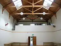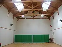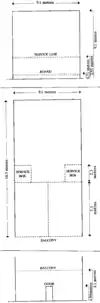 Rackets is played in a 30-by-60-foot (9.1 by 18.3 m) enclosed court, with a ceiling at least 30 feet (9.1 m) high. Singles and doubles are played on the same court. The walls and floor of the court are made of smooth stone or concrete and are generally dark in colour to contrast with the white ball. A player uses a 30.5-inch (77 cm) wooden racket, known as a bat, to hit a 1½-inch (38 mm) hard white ball weighing 1 ounce (28 g). As of September 2018, two companies produce rackets racquets, Grays of Cambridge (UK) and Gold Leaf Athletics (US).[5]