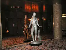 The public areas of Radio City feature the work of many Depression-era artists, who were commissioned by Deskey as part of his general design scheme.[233] The large 2,400-square-foot (220 m2) mural in the grand foyer, "Quest for the Fountain of Eternal Youth", was painted by Ezra Winter and depicts a fable from a Native American tribe in Oregon.[39][45][233][234][235] The murals on the wall of the grand lounge, which depict five eras of differing theater scenes, are collectively known as the "Phantasmagoria of the Theater" by Louis Bouche.[200][219][233][236][237] Three female nudes cast in aluminum were commissioned for the theater, but Roxy thought that they were inappropriate for a family venue.[238] Although the Rockefellers loved the sculptures, the only one that was displayed on opening night was "Goose Girl" by Robert Laurent, which is located on the first mezzanine and depicts a nude aluminum girl beside a slender aluminum goose.[239] Since opening night the other two sculptures have been put on display at Radio City. "Eve" by Gwen Lux is displayed in the southwest corner of the grand foyer,[236][240] and "Spirit of the Dance" by William Zorach is visible from the grand lounge.[213][233][236][241]