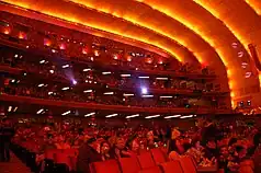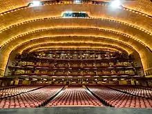 Roxy had a list of design requests for the Music Hall.[34][35] First, he did not want the theater to have either a large balcony over the box seating or rows of box seating facing each other, as implemented in opera houses.[36] One alternative called for "a rather deep balcony" and a shallower second balcony, but would have obstructed views from the rear orchestra.[37][38] Consequently, the final plan used three tiers of balconies, cantilevered off the back wall.[36][37] Second, Roxy specified that the stage contain a central section with three parts so the sets could be changed easily.[30] Roxy wanted red seats because he believed it would make the theater successful,[36] and he wished for the auditorium to be oval in shape because contemporary wisdom held that oval auditoriums had better acoustic qualities.[34][39] Finally, he wanted to build at least 6,201 seats in the Music Hall so it would be larger than the Roxy Theatre. There were only 5,960 audience seats, but Roxy counted exactly 6,201 seats by including elevator stools, orchestra pit seats, and dressing-room chairs.[35] Roxy also wanted the theater to have an "intimate" design as well. According to architect Henry Hofmeister, a single level of steeply raked stadium seating would likely have been used in a larger auditorium, quoting a theatrical proverb: "A house divided against the performer cannot stand."[40]