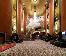 To the ticket lobby's east and the advance sales lobby's northeast is the elliptical grand foyer, whose four-story-high ceiling and dramatic artwork contrast with the compactness of the lobby.[208] The space is about 40 feet (12 m) deep and extends the width of the auditorium.[215] Two long, tubular chandeliers created by Edward F. Caldwell & Co. hang from the ceiling.[208][217] The northern side of the grand foyer contains Ezra Winter's mural. A grand staircase, leading up to the first-mezzanine foyer, runs along the northern wall next to Winter's mural.[200][215][218] Another set of stairs below the grand staircase descends from the northern side of the foyer to the main lounge one level below.[219] A smaller staircase to the first-mezzanine lounge runs along the southern wall, connecting to a curved extension of that level's balcony.[220] The southern and northern sides of the grand foyer, respectively leading to 50th and 51st Streets, contain shallow vestibules with red marble walls. The northern vestibule is used as the exit lobby, while the southern vestibule is an emergency exit.[214] The grand foyer's eastern wall contains openings from the first, second, and third mezzanine levels, and the western wall contains 50-foot-tall (15 m) mirrors within gold frames.[208] Eleven doors leading to the Music Hall's auditorium are also located on the grand foyer's eastern side.[219] Chambellan commissioned several plaques on the auditorium doors' exteriors, which resemble the vaudeville representations in the lobby and depict the types of performances in the Music Hall.[219][221]