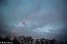 A sleetbow forms in the same way as a typical rainbow, with the exception that it occurs when light passes through falling sleet (ice pellets) instead of liquid water. As light passes through the sleet, the light is refracted causing the rare phenomena. These have been documented across United States with the earliest publicly documented and photographed sleetbow being seen in Richmond, Virginia on December 21, 2012.[62] Just like regular rainbows, these can also come in various forms, with a monochrome sleetbow being documented on January 7, 2016 in Valparaiso, Indiana.