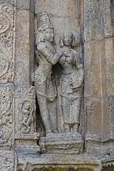 The exterior of the vimana and attached mandapam (hall) have intricately carved pilasters with fluted shafts, double capitals, and pendant lotus brackets. Sculptures are placed in the niches of three sides of the sanctuary walls; maidens enhance the walls in between. The elevation is punctuated with a secondary set of pilasters that support shallow eaves at different levels to cap larger and smaller recesses. The sanctuary is crowned in the traditional fashion with a hemispherical roof. The double-curved eaves of the entrance porch on the east side are concealed in a later columned hall.[72] Dhanvantari, a great physician of the Hindu mythos is considered to be an avatar of Vishnu – there is a separate shrine of Dhanvantari within the temple.[73]