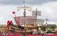 One of the most recognizable features of the stadium is a 103-foot (31 m), 43-ton steel-and-concrete replica pirate ship in the north end zone, making it stand out from other NFL stadiums.[35] Each time the Buccaneers score points, enter the other team's red zone, or win a home game, the replica cannons on the ship are fired off. The cannons fire once for each point scored, and once for entering the red zone. In addition, when the Buccaneers enter their opponent's red zone, stadium hosts hoist team flags around the perimeter of the upper deck. The cannons are also used during pre-game player introductions. During various times throughout the game, the song "Yo Ho (A Pirate's Life for Me)" is played on the stadium public address system (taken from Pirates of the Caribbean), which signals patrons on board the ship to throw beads, T-shirts, and other free prizes to the people below. The segment is also known as a "Mini Gasparilla" to most fans. An animated parrot sits on the stern of the pirate ship. Controlled by radio and remote control, the parrot picks fans out of the crowd and talks to those passing by.[36] The pirate ship's sails, which for NFL games usually shows Buccaneers logos and sponsors, are often changed to suit the event that it hosts.[35]