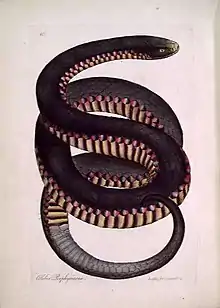 The red-bellied black snake was first described and named by English naturalist George Shaw in Zoology of New Holland (1794) as Coluber porphyriacus.[4] Incorrectly assuming it was harmless and not venomous,[5] he wrote, "This beautiful snake, which appears to be unprovided with tubular teeth or fangs, and consequently not of a venomous nature, is three, sometimes four, feet in nature."[4] The species name is derived from the Greek porphyrous, which can mean "dark purple", "red-purple" or "beauteous".[6][7] It was the first Australian elapid snake described.[5] The syntype is presumed lost.[2] French naturalist Bernard Germain de Lacépède described it under the name Trimeresurus leptocephalus in 1804.[8] His countryman René Lesson described it as Acanthophis tortor in 1826.[9] German biologist Hermann Schlegel felt it was allied with cobras and called it Naja porphyrica in 1837.[10]