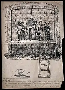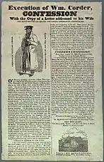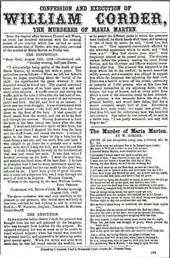 Plays were being performed while Corder was still awaiting trial, and an anonymous author published a melodramatic version of the murder after the execution, a precursor of the Newgate novels which quickly became best-sellers. The Red Barn Murder was a popular subject, along with the story of Jack Sheppard and other highwaymen, thieves and murderers, for penny gaffs, cheap plays performed in the back rooms of public houses.[28] James Catnach sold more than a million broadsides[29][c] (sensationalist single sheet newspapers) which gave details of Corder's confession and execution, and included a sentimental ballad supposedly written by Corder himself (though more likely to have been the work of Catnach or somebody in his employ).[30][31][32] It was one of at least five ballads about the crime that appeared directly following the execution.[33]