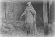 The fascination continued into the 20th century with five film versions, including the 1935 Maria Marten, or The Murder in the Red Barn[41] starring Tod Slaughter,[e] and the 1980 BBC drama Maria Marten, with Pippa Guard in the title role.[46] The story has been dramatised for radio a number of times, including two radio dramas by Slaughter (one broadcast on the BBC Regional Programme in 1934,[47] and one broadcast on the BBC Home Service in 1939[48]), a fictionalised account of the murder produced in 1953 for the CBS radio series Crime Classics, entitled "The Killing Story of William Corder and the Farmer's Daughter."[49][50] and "Hanging Fire", a BBC Monday Play broadcast in 1990 telling the story of the events leading up to the murder as seen through the eyes of Marten's sister Ann.[51] Christopher Bond wrote The Mysterie of Maria Marten and the Murder in the Red Barn in 1991, a melodramatic stage version with some political and folk-tale elements.[52][53] The folk singer Shirley Collins and the Albion Band recorded a song in 1971 entitled "Murder of Maria Marten" on their album No Roses. A part of the song is performed by Florence Pugh in the 2018 television dramatisation of John le Carré's The Little Drummer Girl.