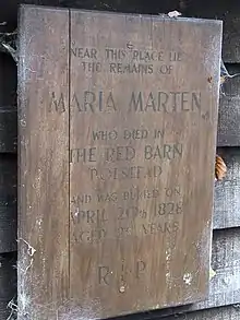 Pieces of the rope which was used to hang Corder sold for a guinea each. Part of his scalp with an ear still attached was displayed in a shop on Oxford Street.[35] A lock of Marten's hair sold for two guineas. Polstead became a tourist venue, with visitors travelling from as far afield as Ireland;[36] Curtis estimated that 200,000 people visited Polstead in 1828 alone.[4] The Red Barn and the Martens' cottage excited particular interest.[36] The barn was stripped for souvenirs, down to the planks being removed from the sides, broken up, and sold as toothpicks.[37] It was slated to be demolished after the trial, but it was left standing and eventually burned down in 1842.[4][d] Even Marten's gravestone in the churchyard of St Mary's, Polstead, was eventually chipped away to nothing by souvenir hunters; only a sign on the shed now marks the approximate place where it stood,[38] although her name is given to Marten's Lane in the village. Pottery models and sketches were sold and songs were composed, including one quoted in the Vaughan Williams opera Hugh the Drover and Five Variants of Dives and Lazarus.