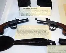 Several copies of Corder's death mask were made and a replica of one is still held at Moyse's Hall Museum. His widow advertised for sale the glasses he purportedly wore at the trial and a snuff box with Maria's likeness.[24] Artefacts from the trial, some of which were in Corder's possession, are also held at the museum.[25] Another replica death mask is kept in the dungeons of Norwich Castle. Corder's skin was tanned by surgeon George Creed and used to bind an account of the murder.[b] This can also be found on display at Moyse's Hall Museum.