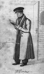 Corder was easily discovered, as Ayres, the constable in Polstead, was able to obtain his old address from a friend. Ayres was assisted by James Lea, an officer of the London police who later led the investigation into "Spring-heeled Jack". They tracked Corder to Everley Grove House, a boarding house for ladies in Brentford.[5] He was running the boarding house with his new wife Mary Moore, whom he had met through a lonely hearts advertisement that he had placed in The Times (which had received more than 100 replies).[6][7][a] Judith Flanders states in her 2011 book that Corder had also placed advertisements in the Morning Herald and The Sunday Times.[8] He received more than forty replies from the Morning Herald and 53 from The Sunday Times that he never picked up.[9] These letters were subsequently published by George Foster in 1828.[10]