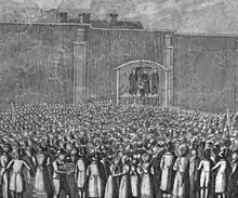 On 11 August 1828, Corder was taken to the gallows in Bury St Edmunds, apparently too weak to stand without support.[18] He was hanged shortly before noon in front of a large crowd; one newspaper claimed that there were 7,000 spectators, another as many as 20,000.[19] At the prompting of the prison governor, just before the hood was drawn over his head, he said: