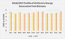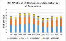 Using data from Electric Power Annual 2018[31] capacity projections, the expected changes in generating capabilities for renewable fuel sources would result in an increase of 55.873 GW of capacity coming on-line by the beginning of 2024. This would make a total of 277.77 gigawatts of renewable available by 2024 up 23.1% from 2018. Using this generating capability and the capacity factors from 2018 data will result in a total of 798.19 terawatt-hours (TWh) of renewable electric energy in 2023. This would be up 61.84 TWh (+8.3%) from 2018.
