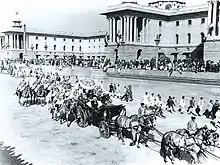 The Delhi Republic Day parade is held in the capital, New Delhi and is organised by the Ministry of Defence. Commencing from the gates of the Rashtrapati Bhavan (the President's residence), Raisina Hill on Rajpath past the India Gate, this event is the extravagant attraction of India's Republic Day Celebrations and lasts for three days. The parade showcases India's Defence Capability, Cultural and Social Heritage.[9] Nine to twelve different regiments of the Indian Army in addition to the Navy, and Air Force with their bands march past in all their finery and official decorations. The President of India who is the Commander-in-Chief of the Indian Armed Forces, takes the salute. Twelve contingents of various para-military forces of India and police forces also take part in this parade.[10]