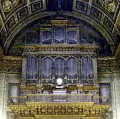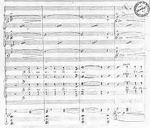 Five of the seven sections of the Requiem were completed by January 1888 and performed that month at the Madeleine for the funeral of the architect Joseph Lesoufaché.[5][n 1] This version lacked the Offertoire and Libera me, which Fauré added at some time in the following decade.[13] The Libera me predates the rest of the Requiem, having been composed eleven years earlier as a baritone solo.[3] The forces required for the original 1888 version were a choir about forty in number consisting of boys and men (the Madeleine did not admit female choristers), solo boy treble, harp, timpani, organ, strings (solo violin, divided violas, divided cellos and basses). For a performance at the Madeleine in May 1888 Fauré added horn and trumpet parts.[14]