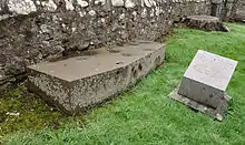 Violent mobs were not the only problems body snatchers faced. Naples also wrote of how he met "patrols" and how "dogs flew at us",[41] references to some of the measures taken to secure graves against his ilk. The aristocracy and very rich placed their dead in triple coffins, vaults and private chapels, sometimes guarded by servants. For the less wealthy, double coffins were available, buried on private land in deep graves. More basic defences included the placing of heavy weights over the coffin, or simply filling the grave with stones rather than soil. Such deterrents were sometimes deployed in vain; at least one London graveyard was owned by an anatomist who, it was reported, "obtained a famous supply [of cadavers] ... and he could charge pretty handsomely for burying a body there, and afterwards get from his pupils from eight to twelve guineas for taking it up again!"[42] Ever more elaborate creations included The Patent Coffin, an iron contraption with concealed springs to prevent any levering of its lid. Corpses were sometimes secured inside their caskets by iron straps, while other designs used special screws to reinforce metal bands placed around the coffin.[43][44] In Scotland, iron cages called mortsafes either encased buried coffins, or were set in a concrete foundation and covered the whole grave.[lower-alpha 7] Some covered more than one coffin, while others took the form of iron lattices fixed beneath large stone slabs, buried with the coffin.[43][44] They may not have been secure enough; as one 20th-century writer observed, an empty coffin found beneath a buried mortsafe in Aberlour had probably been "opened during the night succeeding the funeral, and carefully closed again, so that the disturbance of the soil had escaped notice or had been attributed to the original burial."[46]
