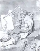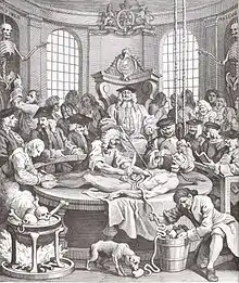 Some aspects of the popular view of dissection were exemplified by the final panel of William Hogarth's The Four Stages of Cruelty, a series of engravings that depict a felon's journey to the anatomical theatre.[59] The chief surgeon (John Freke)[60] appears as a magistrate, watching over the examination of the murderer Tom Nero's body by the Company of Surgeons. According to author Fiona Haslam, the scene reflects a popular view that surgeons were "on the whole, disreputable, insensitive to human suffering and prone to victimis[ing] people in the same way that criminals victimised their prey."[61] Another popular belief alluded to by Hogarth was that surgeons were so ignorant of the respect due to their subjects, that they allowed the remains to become offal. In reality, the rough treatment exacted by body snatchers on corpses continued on the premises they delivered to. Joshua Brookes once admitted that he had kicked a corpse in a sack down a flight of stairs,[62] while Robert Christison complained of the "shocking indecency without any qualifying wit" demonstrated by a male lecturer who dissected a woman.[63] Pranks were also common; a London student who jokingly dropped an amputated leg down a household chimney, into a housewife's stewpot, caused a riot.[64]
