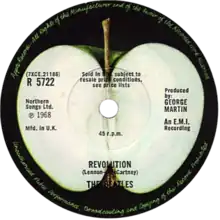 "Revolution" is a song by the English rock band the Beatles, written by John Lennon and credited to the Lennon–McCartney partnership. Three versions of the song were recorded and released in 1968, all during sessions for the Beatles' self-titled double album, also known as "the White Album": a slow, bluesy arrangement (titled "Revolution 1") that would make the final cut for the LP; an abstract sound collage (titled "Revolution 9") that originated as the latter part of "Revolution 1" and appears on the same album; and the faster, hard rock version similar to "Revolution 1", released as the B-side of "Hey Jude". Although the single version was issued first, it was recorded several weeks after "Revolution 1", as a remake specifically intended for release as a single. In addition, a promotional video for the song was shot, using the musical backing track from the hard rock version, along with live-sung lyrics that more closely resemble the "Revolution 1" version.