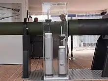 The Israeli Army introduced a new round known as the laser homing anti-tank (LAHAT) projectile.[2] Using a semi-active laser homing guidance method, the LAHAT can be guided by the tank's crew or by teams on the ground, while the missile's trajectory can be selected to either attack from the top (to defeat enemy armour) or direct attack (to engage enemy helicopters). Furthermore, the missile can be fired by both 105-millimetre (4.1 in) and 120-millimetre (4.7 in) tank guns.[79] The LAHAT has been offered as an option for the Leopard 2, and has been marketed by both Israel Military Industries and Rheinmetall to Leopard 2 users.[80] Israeli Merkavas make use of a round known as the APAM, which is an anti-personnel munition designed to release fragmentation at controlled intervals to limit the extent of damage. Fragments are shaped to have enough kinetic energy to penetrate body armour.[81] Poland has introduced a series of projectiles for Rheinmetall's tank gun, including an armour-piercing penetrator target practice round (APFSDS-T-TP), a high-explosive round, and a high-explosive target practice (HE-TP) projectile. The ammunition is manufactured by Zakłady Produkcji Specjalnej Sp. z o.o.[82]