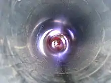Rheinmetall's L/44 tank gun has a calibre of 120 mm, a length of 44 calibres (5.28 metres (17.3 ft)), and a chamber volume of 10.2 liters (622.44 in3).[22][23] The gun's barrel weighs 1,190 kilograms (2,620 lb),[24] and on the M1 Abrams the gun mount weighs 3,317 kilograms (7,313 lb),[25] while the new barrel (L/55) is 55 calibres long, 1.30 metres (4.3 ft) longer. The bore evacuator and the gun's thermal sleeve, designed to regulate the temperature of the barrel, are made of glass-reinforced plastic, while the barrel has a chrome lining to increase barrel life.[4] Originally the gun had an EFC barrel life of ~1,500 rounds,[26] but with recent advances in propellant technology, the average life has increased even further.[27] The gun's recoil mechanism is composed of two hydraulic retarders and a hydropneumatic assembly.[4]