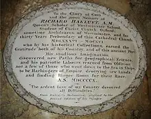 ![]() Hakluyt depicted in stained glass in the west window of the south transept of Bristol Cathedral – Charles Eamer Kempe, c. 1905. | |