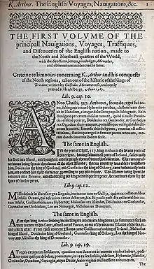 Richard Hakluyt (/ˈhæklʊt, ˈhæklət, ˈhækəlwɪt/;[1] 1553 – 23 November 1616) was an English writer. He is known for promoting the English colonization of North America through his works, notably Divers Voyages Touching the Discoverie of America (1582) and The Principal Navigations, Voyages, Traffiques and Discoveries of the English Nation (1589–1600).