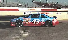 Joining in the Chrysler boycott of NASCAR due to the organizing body's ban of the Hemi engine, Petty spent much of 1965 competing as a drag racer. Petty Enterprises installed the Hemi in the new compact Barracuda and lettered "OUTLAWED" on the door. He crashed this car at Southeastern Dragway, in Dallas, Georgia, on February 28, 1965, killing an eight-year-old boy and injuring seven others.[10][11] Petty, his father Lee, and Chrysler Corporation faced lawsuits totaling more than $1 million, though Petty and his team came to settlements with the lawsuits within 1 month of the suits being filed.[12] Afterwards, a second Hemi Barracuda was built, this time with an altered wheelbase and eventually with Hilborn fuel injection. This car was lettered with a large "43 JR" on the door. The car was very successful, winning its class at the Bristol Spring Nationals and competing in many match races against well-known racers such as Ronnie Sox, Don Nicholson, Phil Bonner, Huston Platt, Hubert Platt and Dave Strickler. Even after returning to NASCAR once the Hemi was reinstated, Richard continued drag racing the 43 JR until early 1966. ± On February 27, 1966, Richard Petty overcame a 2-lap deficit to win his second Daytona 500 when the race was stopped on lap 198 of 200 because of a thunderstorm. This made him the first driver to win the event twice. In 1966, he won the first ever race at Middle Georgia Raceway (Morelock 200). Petty broke the half-mile NASCAR record for half-mile tracks with an average speed of 82.023 miles per hour during the 100-mile (160 km) event.[13] He would end up recording 4 wins there in his career, including one in 1970 in which he was very ill before the race. 1967 was a milestone year. In that year, Petty won 27 of the 48 races he entered, including a record 10 wins in a row (between August 12 and October 1, 1967). He won his second Grand National Championship. One of the 27 victories was the Southern 500 at Darlington, which would be his only Southern 500 victory. His dominance in this season earned him the nickname "King Richard". He had previously been known as "the Randleman Rocket".[14]