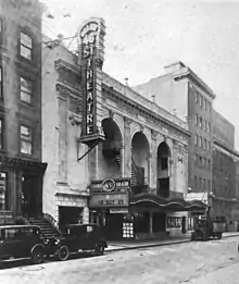 The facade consists of two sections. The eastern section is wider and is symmetrical, containing the auditorium entrance. It is made of glazed white brick with white terracotta decorations.[15][16] The upper stories of the auditorium-entrance section are designed as a colonnade with a central loggia.[17] The western section, which contains the stage house, is seven stories high and contains a buff-brick facade.[15][16] Early sources cite the theater facade as also containing limestone.[18][19]