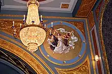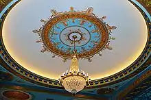 A sounding board curves onto the ceiling above the proscenium arch, separated from the proscenium and the ceiling by a pair of ribs.[28] The sounding board is decorated with low relief plasterwork and latticework.[33] The ceiling has a shallow dome surrounded by a molded band. There are bands within the dome itself, dividing the dome's surfaces into panels. The center of the dome has a plasterwork medallion at the center, from which hangs a chandelier.[34] The rest of the ceiling, surrounding the dome, is divided into panels by moldings. These panels contain grilles as well as medallions in low relief.[28]
