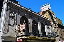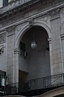 The auditorium's second and third stories contain outer bays that flank a loggia with three arches. Each arch has a keystone with a console bracket, and they are flanked by pilasters with Corinthian-style capitals with terracotta swans.[15][20] The bottoms of the central bays contain an iron railing.[16] Behind the arches is a fire stair and a brick wall with terracotta lyres, swags, and bellflowers.[15][22] The outer bays contain white-brick wall sections, which are topped by swags and rectangular panels with masks. There are pilasters next to each of the outer bays, and a sign with the theater's name is suspended from the easternmost bay.[20][23] Running above the facade is a entablature, containing a frieze with panels, shields, and rinceaux, as well as a cornice supported by terracotta modillions. The roof of the auditorium has a terracotta balustrade with urns that divide it into bays. The center three bays of the balustrade have latticework while the outer bays have shields and foliate decorations. Another brick parapet, with terracotta coping, runs behind the terracotta balustrade.[22][23]