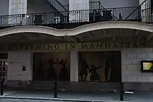 The first story of the auditorium facade is symmetrically arranged, though the eastern section is shorter than its width. There is a water table made of terrazzo, above which are rusticated blocks. On the eastern side of the ground-floor facade, a double metal door connects to a service alley. To the right, or west, are three glass-and-aluminum double doors connecting with the box office lobby. Next to that, terrazzo steps lead to emergency-exit doors from the auditorium.[20] The westernmost opening consists of a metal stage door.[13][20] The ground story has wooden display boxes and is topped by a cornice.[20] A marquee hangs over the center three openings; it replaced the original marquee,[18][19] which has since been removed.[21]