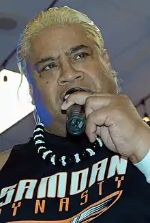 Solofa Fatu Jr.[1] (born October 11, 1965) is an American professional wrestler, best known under the ring names Rikishi and Fatu with World Wrestling Entertainment (WWE), where he is a one-time Intercontinental Champion, two-time World Tag Team Champion, and one-time WWE Tag Team Champion. He is a member of the Anoa'i family of Samoan wrestlers. He was inducted into the WWE Hall of Fame by his sons, wrestlers Jey and Jimmy Uso, in 2015.