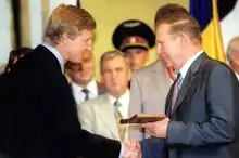 In June 2005, Serhiy Kornich, then head of the Interior Ministry's economic crimes department, stated publicly that Akhmetov was "the head of [an] organized crime group."[43] That year, Borys Kolesnikov, a friend and associate who had been tied to Akhmetov since the 1980s, was arrested on charges of extortion and conspiracy to assassinate a rival Donetsk businessman.[40] Charges against Akhmetov and Kolesnikov were dropped in 2006 amid a significant rise in political power by the former,[40] and the cooperation of the Yuschenko government,[42] ending Akhmetov's exile.